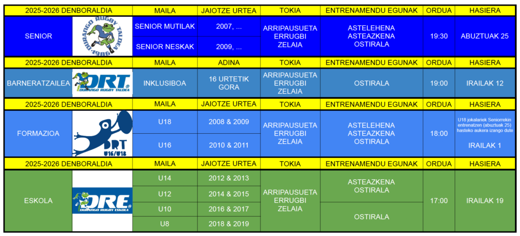 Hemen, 2025-2026 denboraldiko hasiera datak, mailak, ordutegiak eta abar aurkituko dituzu: